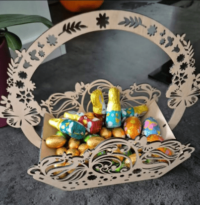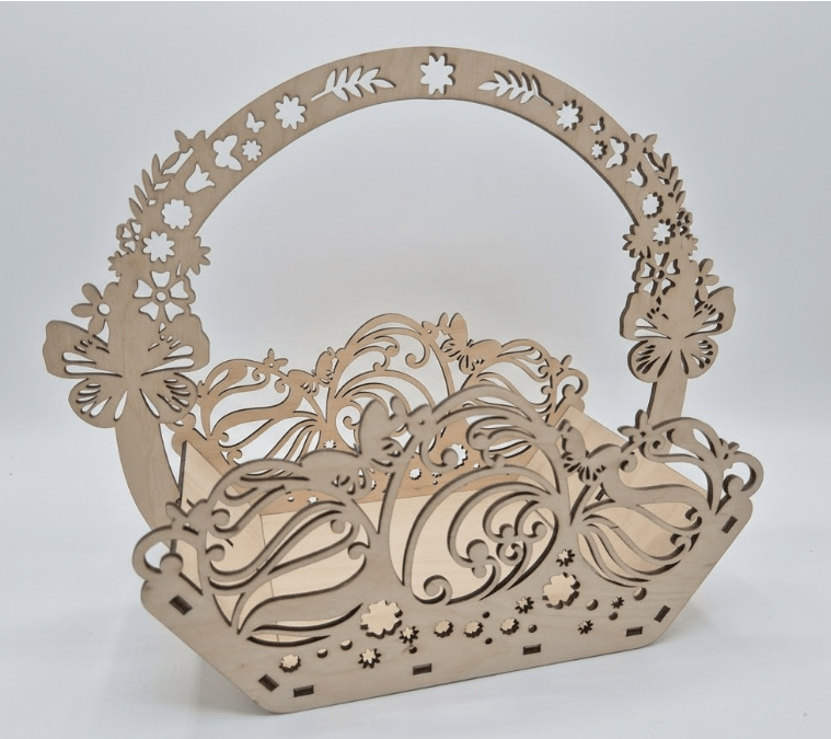 Ajoutez une touche naturelle et raffinée à votre chasse aux œufs avec ce magnifique panier de Pâques en bois découpé au laser. Son design délicat avec des motifs floraux, papillons et volutes en fait à la fois un panier pratique pour ramasser les chocolats et une superbe décoration printanière.